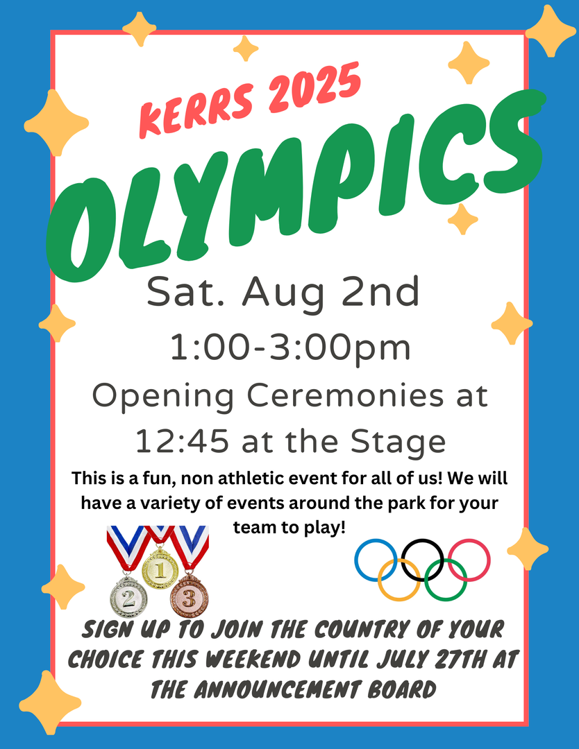 Today is the day, The Olympics are here! We are looking forward to a fantastic day! We ask that everyone who has signed up (60 people 😍)to play or volunteer to run an event to please come to the stage between 12:30-12:45 so you can meet your team and get organized. We will start with our Opening Ceremonies at 1:00 at the stage! If you aren’t participating today you are more than welcome to cheer teams on and join us for the opening and closing ceremonies at the stage! Events will take place all around camp between 1-3. Thanks everyone!